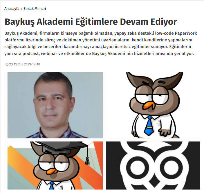 Baykuş Akademi Test ve Eğitim Yöneticisi Turgut İnanbak eğitimlerin amacını şöyle anlatıyor: “Müşterilerimizin, süreçlerini kendi kendilerine yönetmelerini ve çevik bir organizasyon olmalarına katkıda bulunmayı hedefliyoruz. Farklı disiplinlerden gelen eğitmenlerle katılımcılara bir vizyon sunuyoruz. Bu eğitimlerle, PaperWork platformunu kullanarak süreçlerini istedikleri gibi uyarlayabiliyorlar. Eğitimin ilk bölümünde kavramlar üzerinde duruluyor. Kavramsal eğitimler konusunda uzman önemli isimler tarafından veriliyor. İlerleyen bölümlerde katılımcılara eğitmen eşliğinde canlı olarak uygulama üzerinde çalışma imkanı sağlıyoruz. Tüm eğitim sonunda yani 25 günlük eğitim tamamlandığında katılımcılar bir sınava giriyorlar ve sertifikaya hak kazanıyorlar.”