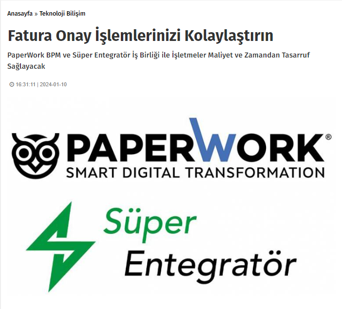 PaperWork BPM ve Süper Entegratör İş Birliği, Fatura Onay Süreçlerini Otomatikleştiriyor