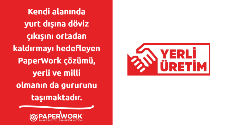 Her alanda yerli ve milli üretim, yerli ve milli bakış açısı artık Türkiye’nin en önemli politikalarından biri olmuştur. Yazılım sektöründe ve müşterilerimizde de milli bakış açısı yaygınlaşmaktadır. Kendi alanında yurt dışına döviz çıkışını ortadan kaldırmayı hedefleyen PaperWork çözümü, yerli ve milli olmanın da gururunu taşımaktadır.
